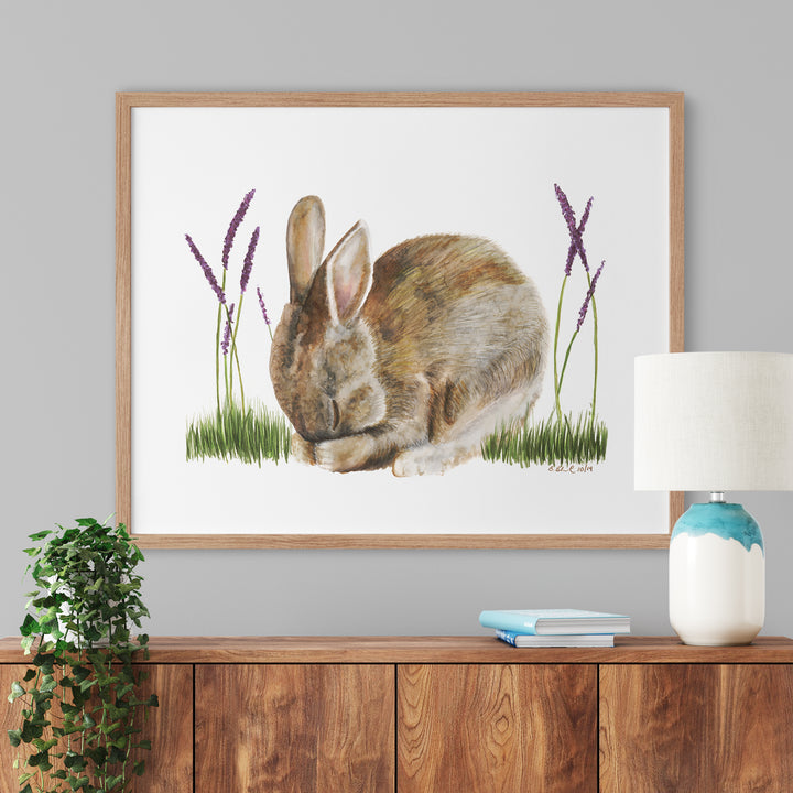 This adorable sleeping bunny rabbit is a lovely way to decorate your woodland themed nursery. With touches of lavender, the little bunny will bring joy to your little one.