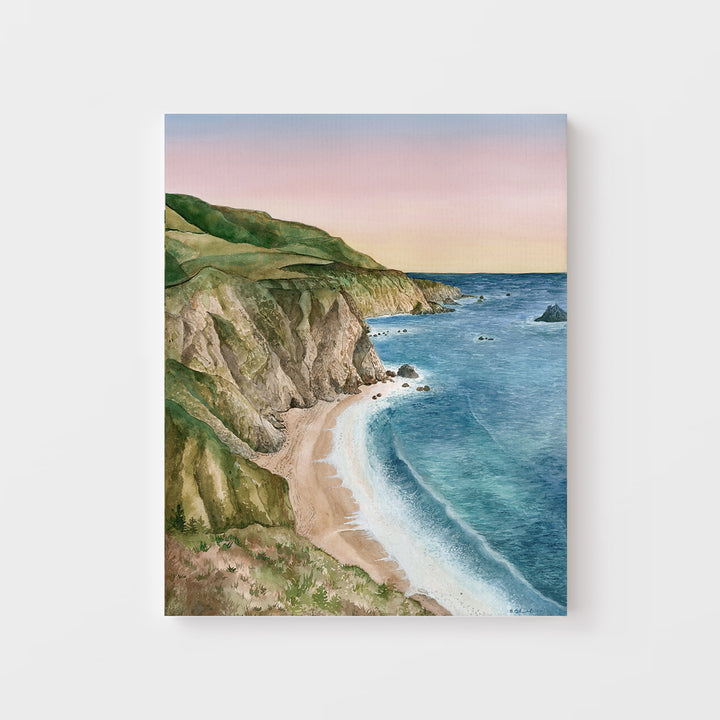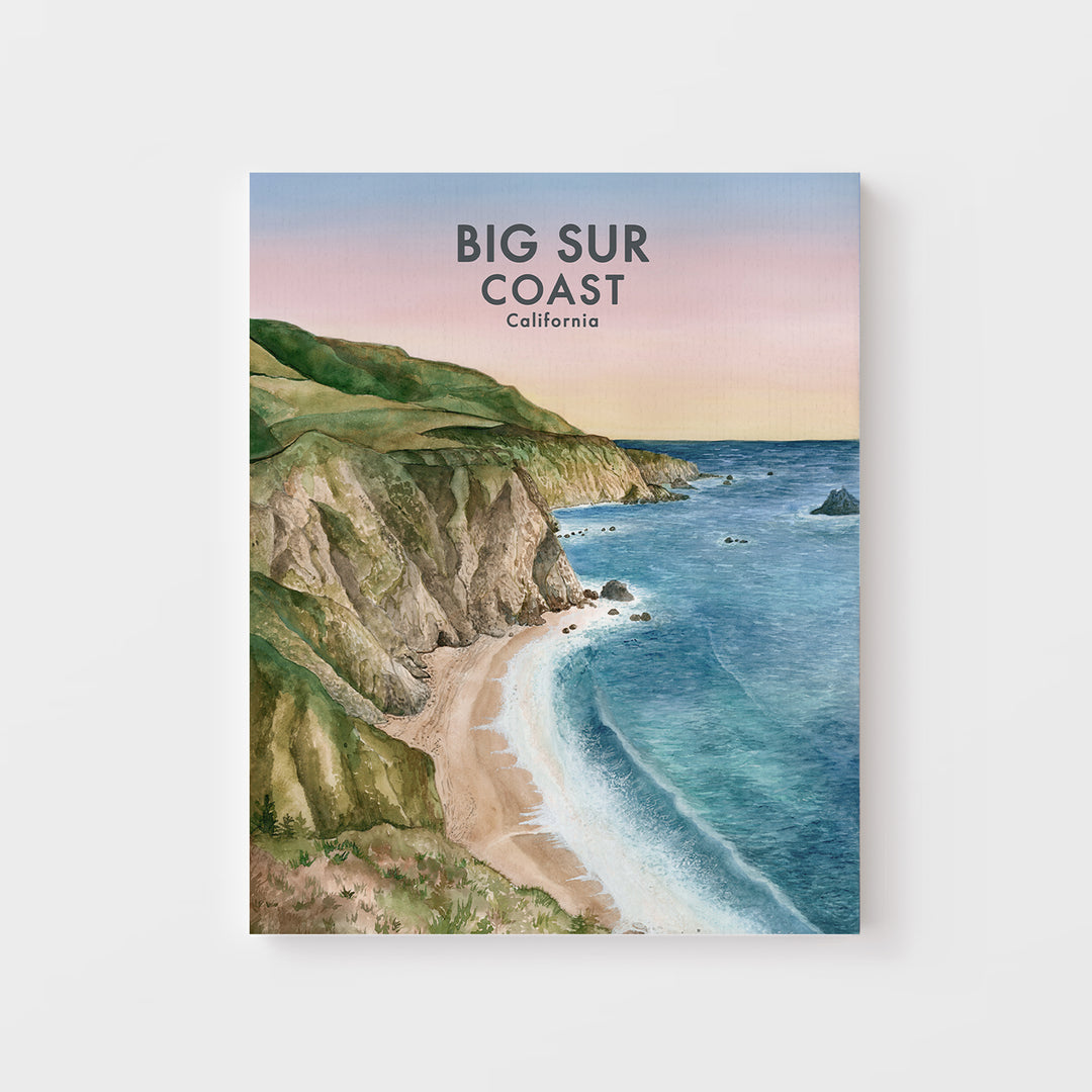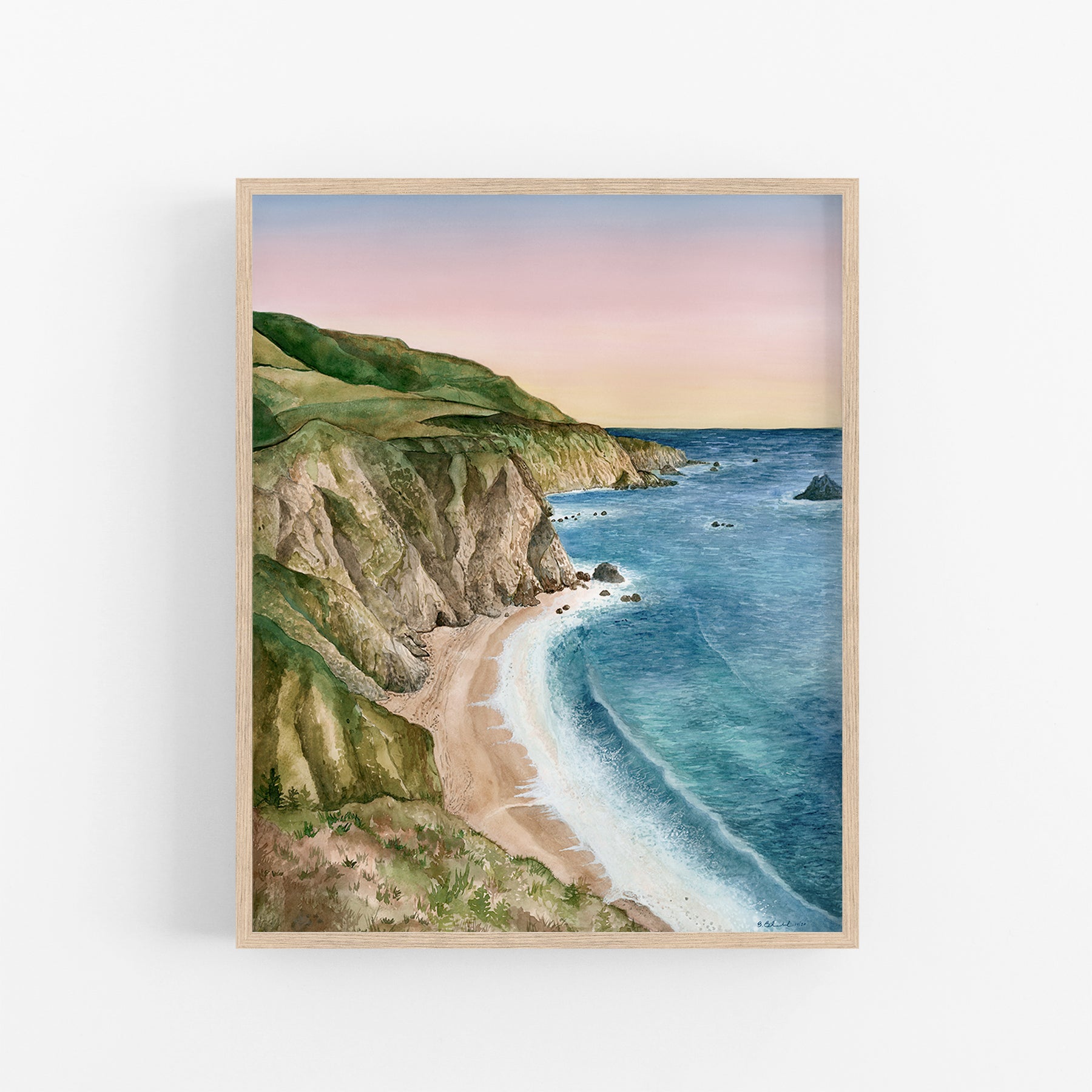 Beautiful landscape watercolor of the Big Sur Coast with the surf splashing up on the rocky coast. Perfect as a housewarming gift for the traveler or hiker in your life. Pair with other landscape watercolor prints to create a travel decor themed wall.